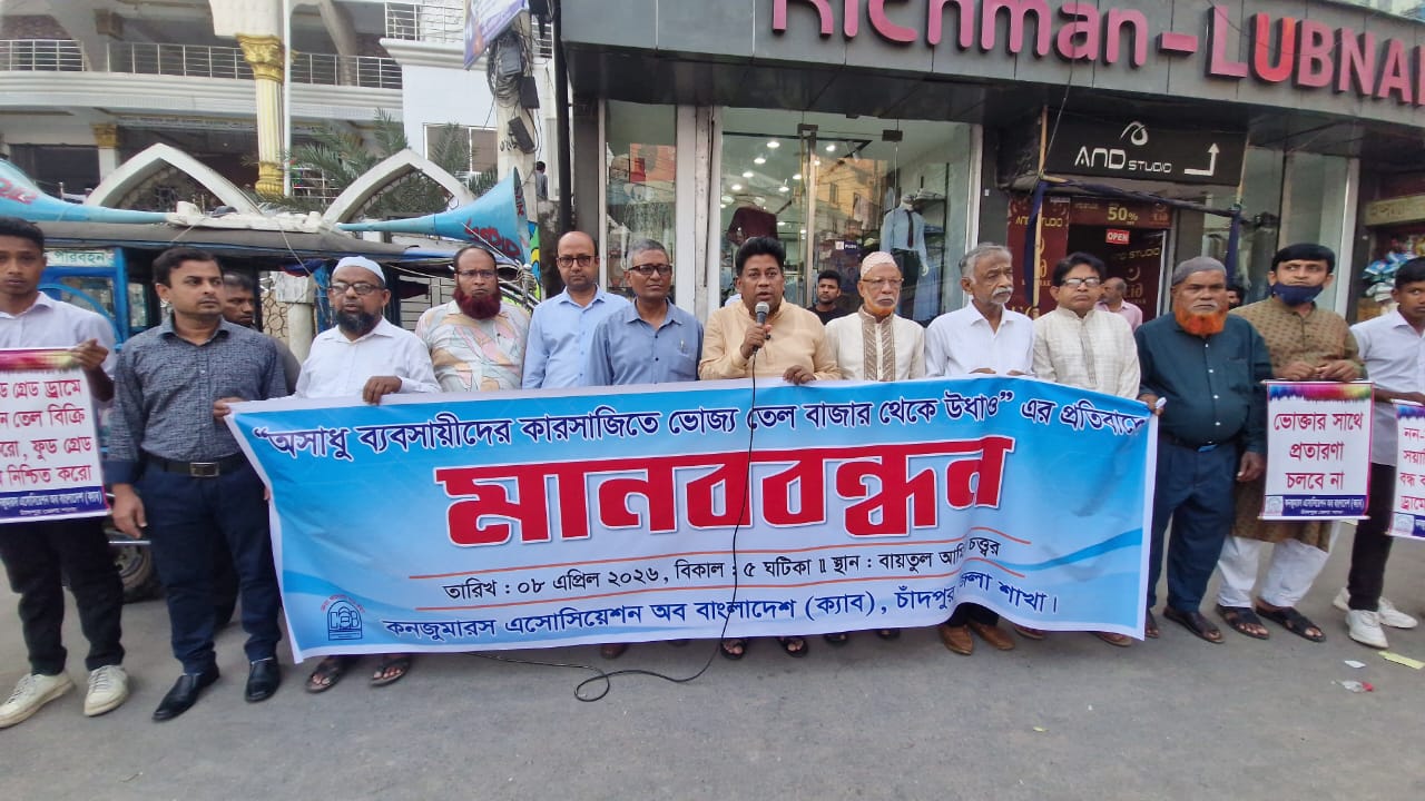 বোতলজাত ভোজ্য তেল বাজার থেকে উধাও এর প্রতিবাদে চাঁদপুর জেলা ক্যাবের মানববন্ধন