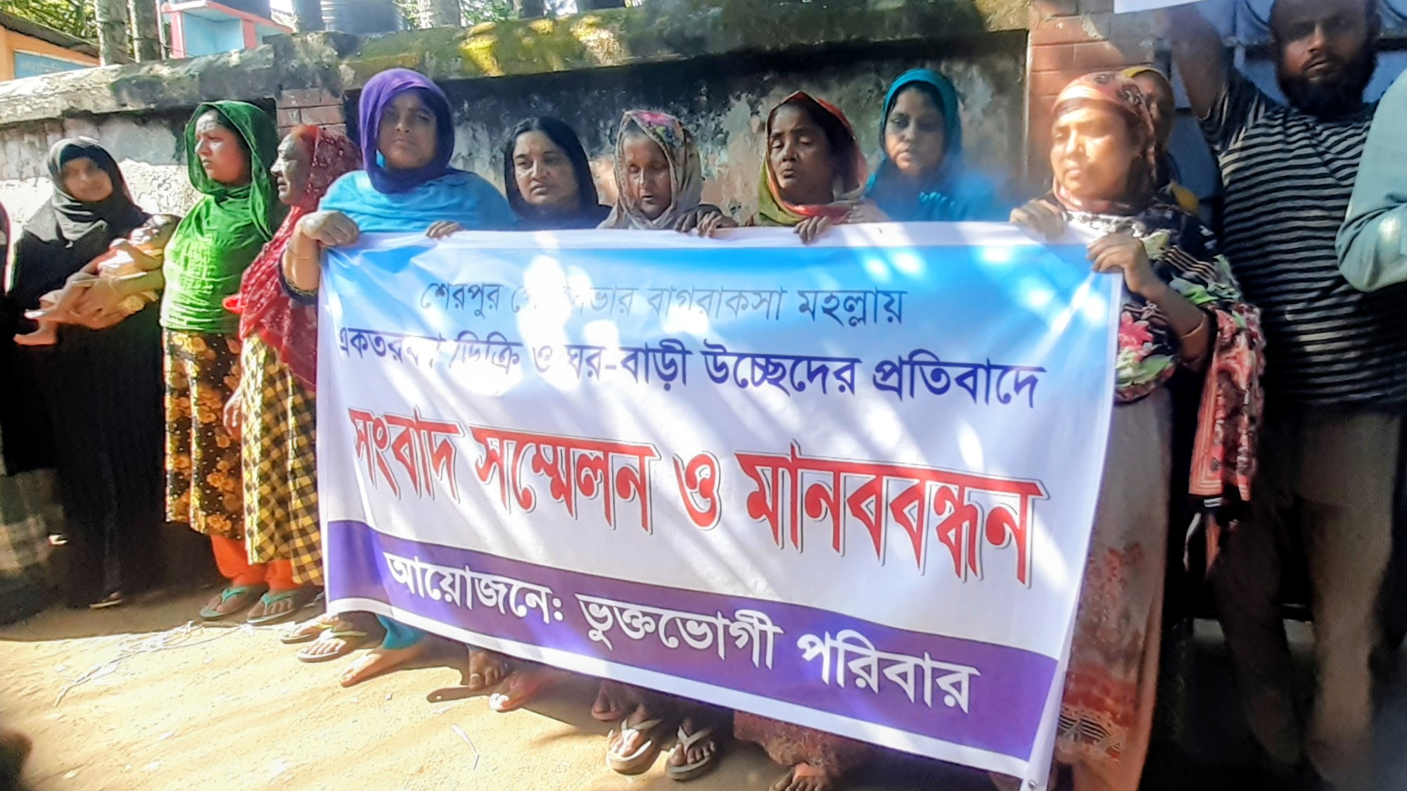 শেরপুরে একতরফা ডিক্রি ও ঘর-বাড়ি উচ্ছেদের প্রতিবাদে মানববন্ধন
