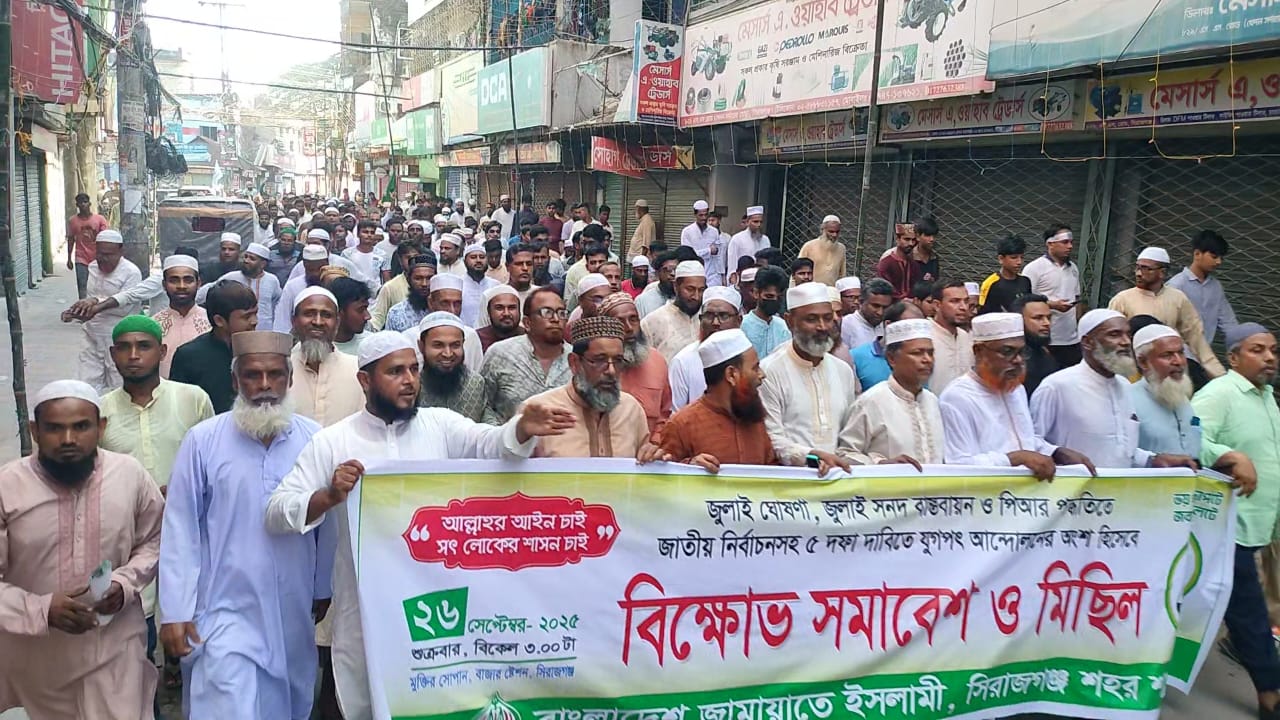 বিক্ষোভ সমাবেশে সভাপতিত্ব করেন সিরাজগঞ্জ শহর শাখার আমীর অধ্যাপক আব্দুল লতিফ। সঞ্চালনা করেন শহর শাখার সেক্রেটারি মাওলানা মোস্তফা মাহমুদ। এতে বিশেষ অতিথি হিসেবে বক্তব্য রাখেন সিরাজগঞ্জ জেলা আমীর মাওলানা শাহীনুর আলম, সহকারী সেক্রেটারি অধ্যাপক মাওলানা শহিদুল ইসলাম প্রমুখ। এ বিক্ষোভ মিছিলে জামায়াতের হাজারো নেতা-কর্মী অংশ নেন।