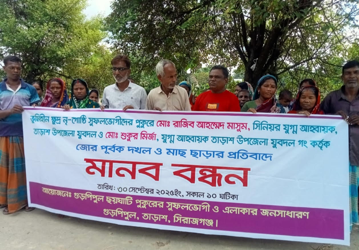 সিরাজগঞ্জের তাড়াশে ক্ষুদ্র নৃ-গোষ্ঠী সুফলভোগীদের পুকুর দখল চেষ্টার অভিযোগে উপজেলা যুবদলের দুই নেতার বিরুদ্ধে মানববন্ধন ও থানায় অভিযোগ দায়ের করা হয়েছে। অভিযুক্তরা হলেন তাড়াশ উপজেলা যুবদলের সিনিয়র যুগ্ম আহ্বায়ক রাজীব আহমেদ মাসুম ও যুগ্ম আহ্বায়ক শুকুর মির্জা।