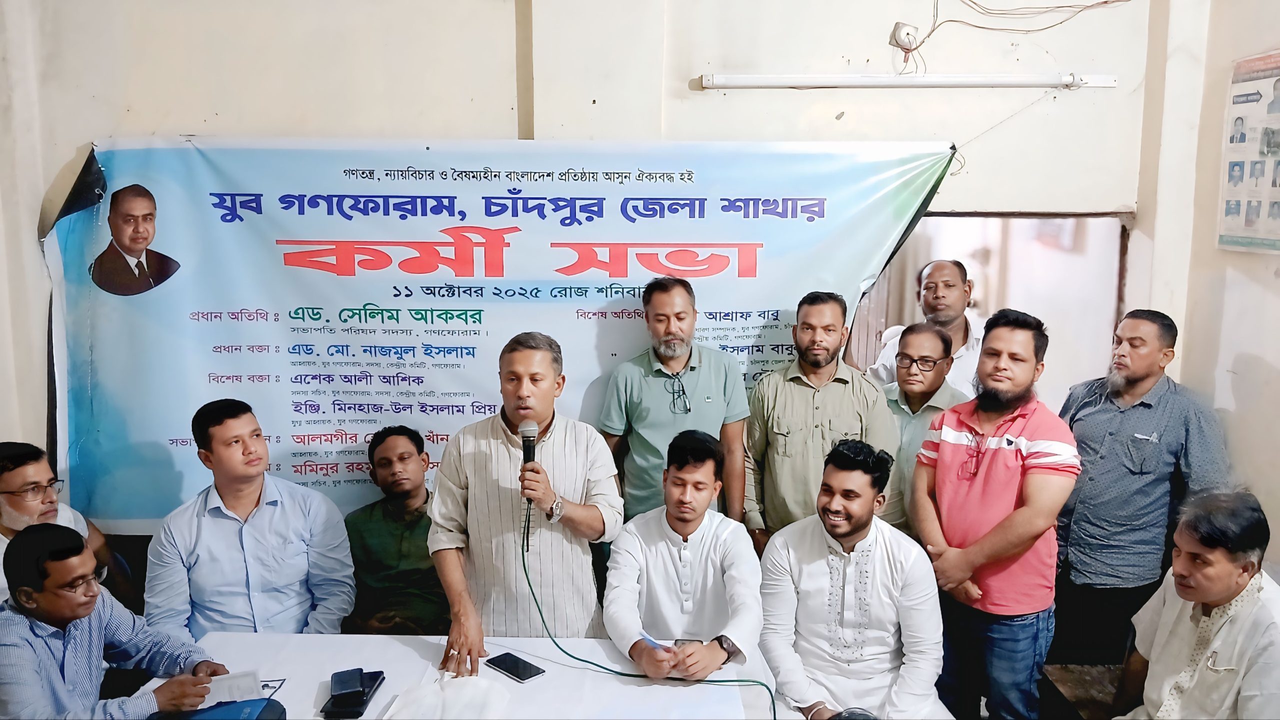 গণতন্ত্র, ন্যায়বিচার ও বৈষম্যহীন বাংলাদেশ প্রতিষ্ঠায় যুব গণফোরাম চাঁদপুর জেলা শাখার উদ্যোগে কর্মী সভা অনুষ্ঠিত হয়েছে।