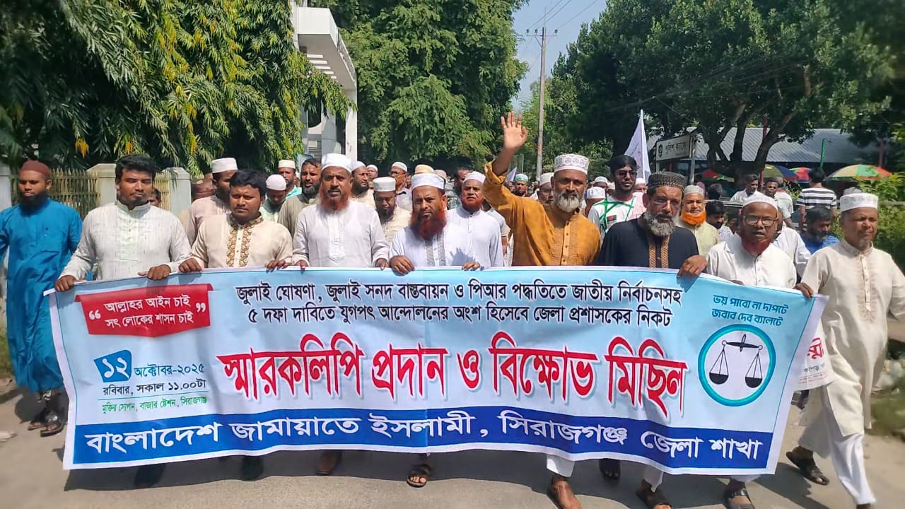 জুলাই ঘোষণা, জুলাই সনদ বাস্তবায়ন ও পিআর পদ্ধতিতে জাতীয় নির্বাচনসহ ৫ দফা দাবিতে দেশব্যাপী কর্মসূচির অংশ হিসেবে সিরাজগঞ্জ জেলা জামায়াতে ইসলামী বিক্ষোভ সমাবেশ ও জেলা প্রশাসকের নিকট স্মারকলিপি প্রদান করেছে।