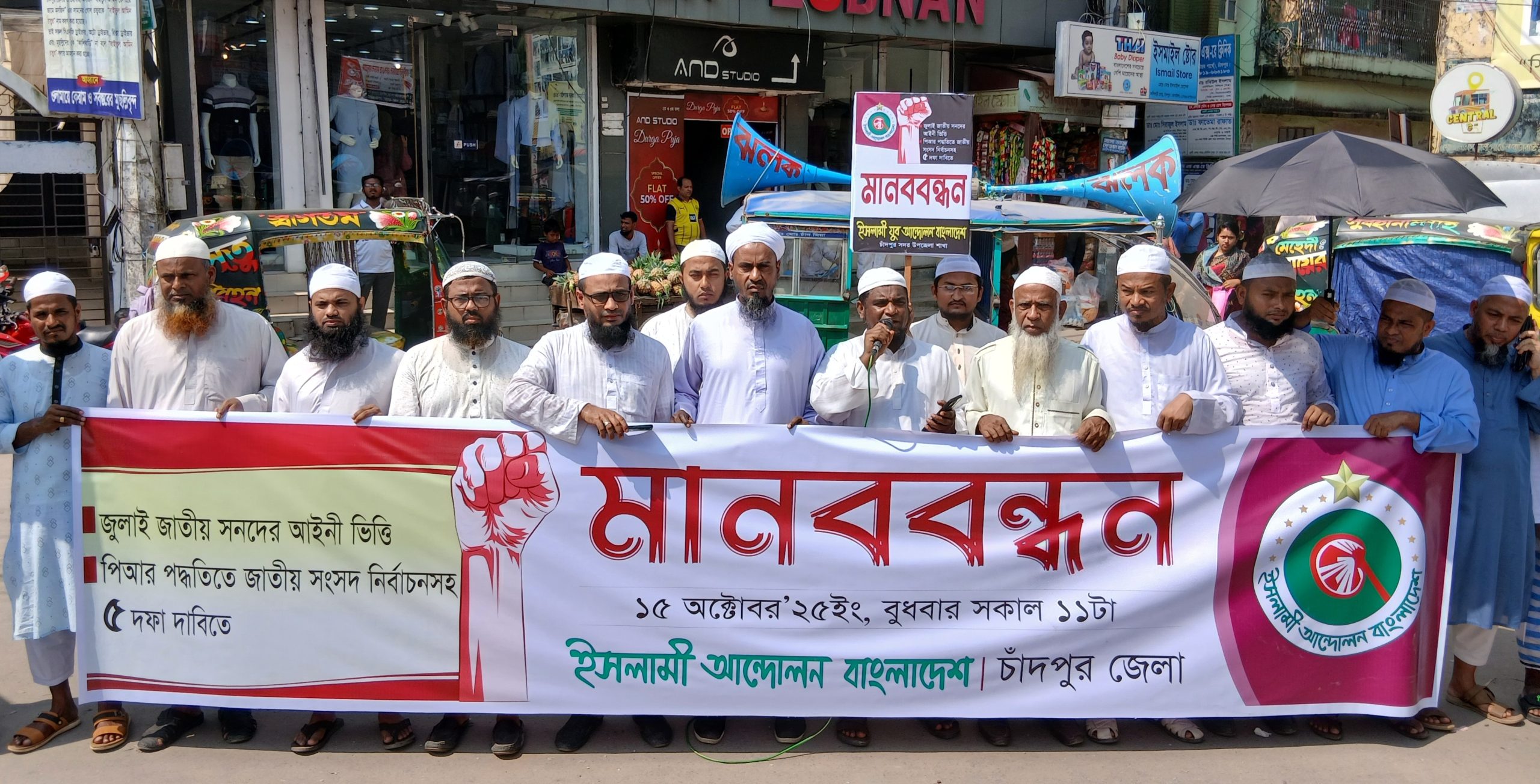 বুধবার (১৫ অক্টোবর) সকাল ১১টায় দেশব্যাপী কর্মসূচির অংশ হিসেবে ইসলামী আন্দোলন বাংলাদেশ চাঁদপুর জেলা শাখার উদ্যোগে- আগামি জাতীয় নির্বাচনের পূর্বে জুলাই সনদ বাস্তবায়নের আদেশ জারি ও উক্ত আদেশের ওপর গণভোট আয়োজন করা, আগামি জাতীয় নির্বাচনে উভয় কক্ষে পিআর পদ্ধতি চালু করা, অবাধ, সুষ্ঠু ও গ্রহণযোগ্য নির্বাচনের লক্ষে সকলের জন্য লেভেল প্লেয়িং ফিল্ড নিশ্চিত করা, ফ্যাসিস্ট সরকারের সকল জুলুম, নির্যাতন, গণহত্যা ও দুর্নীতির বিচার দৃশ্যমান করা, স্বৈরাচারের দোসর জাতীয় পার্টি ও ১৪ দলের কার্যক্রম নিষিদ্ধের দাবিতে আয়োজিত মানববন্ধন অনুষ্ঠানে সভাপতির বক্তব্যে তিনি উপরোক্ত কথা বলেন।
