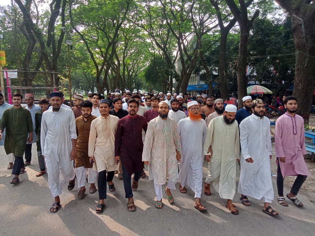 শুক্রবার (১৭ অক্টোবর) বাদ জুমা বিশ্ববিদ্যালয়ের কেন্দ্রীয় মসজিদ থেকে একটি বিক্ষোভ মিছিল বের হয়, যা ক্যাম্পাসের প্রধান সড়ক প্রদক্ষিণ করে বিশ্ববিদ্যালয়ের প্রধান ফটকে সমবেত হয়ে সংক্ষিপ্ত সমাবেশ মধ্যে দিয়ে শেষ হয়। এ সময় শিক্ষার্থীরা বিচার দাবি করে বিভিন্ন স্লোগান দেন এবং ঘটনাটির ন্যায়বিচার নিশ্চিতে প্রশাসনের দ্রুত পদক্ষেপের আহ্বান জানান।